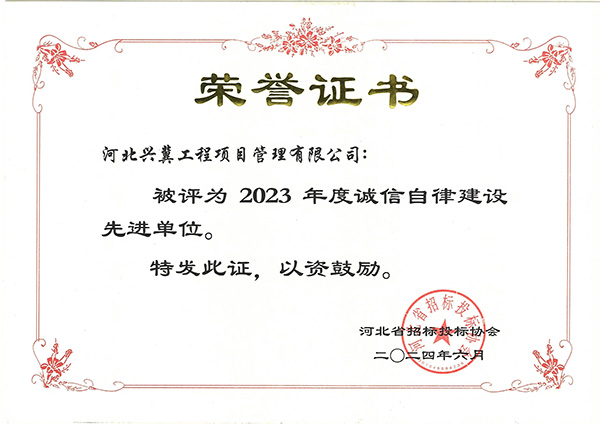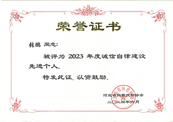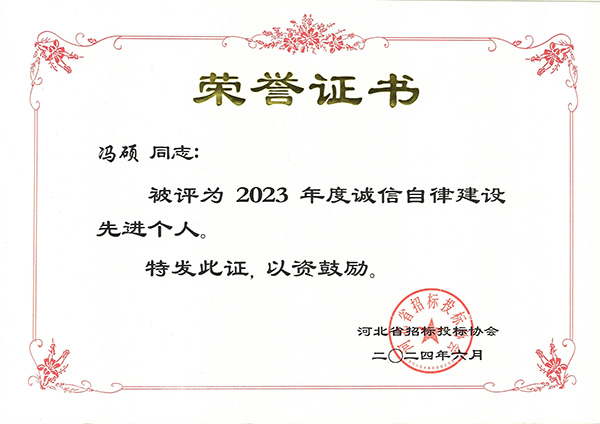 热烈祝贺我单位被评为2023年度诚信自律建设先进单位。热烈祝贺我单位张鹏、冯硕、范中甜三位同志被评为2023年度诚信自律建设先进个人。