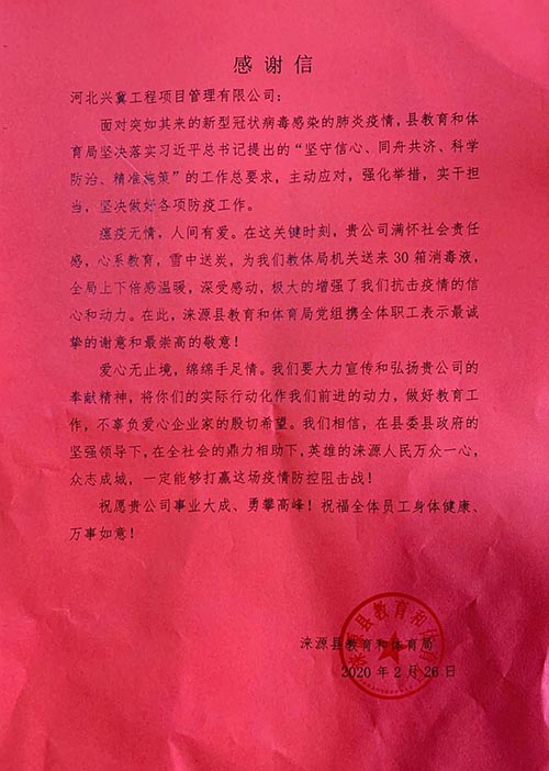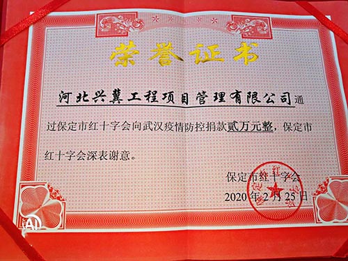 人间自有真情在,抗击疫情,人人有责。2020年2月15日兴冀公司董事长李杏娜、工会主席刘坚一行至保定市红十字基金会,捐款人民币两万元整;2月16号至涞源县教育局捐赠100箱消毒液;2月17日至保定市教育局捐赠50箱消毒液。疫情挡不住温情,兴冀公司全体同仁与祖国同气连枝,共盼春来。中国加油!