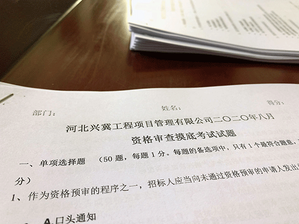 2021年3月26日,为了检验公司业务人员对招标投标总体理解以及资格审查相关法律法规分析解决招标采购实际问题的工作能力和业务水平,兴冀公司组织了业务人员“资格审查相关知识”考试。希望应试人员通过这次考试,查漏补缺,提高自己的业务水平。