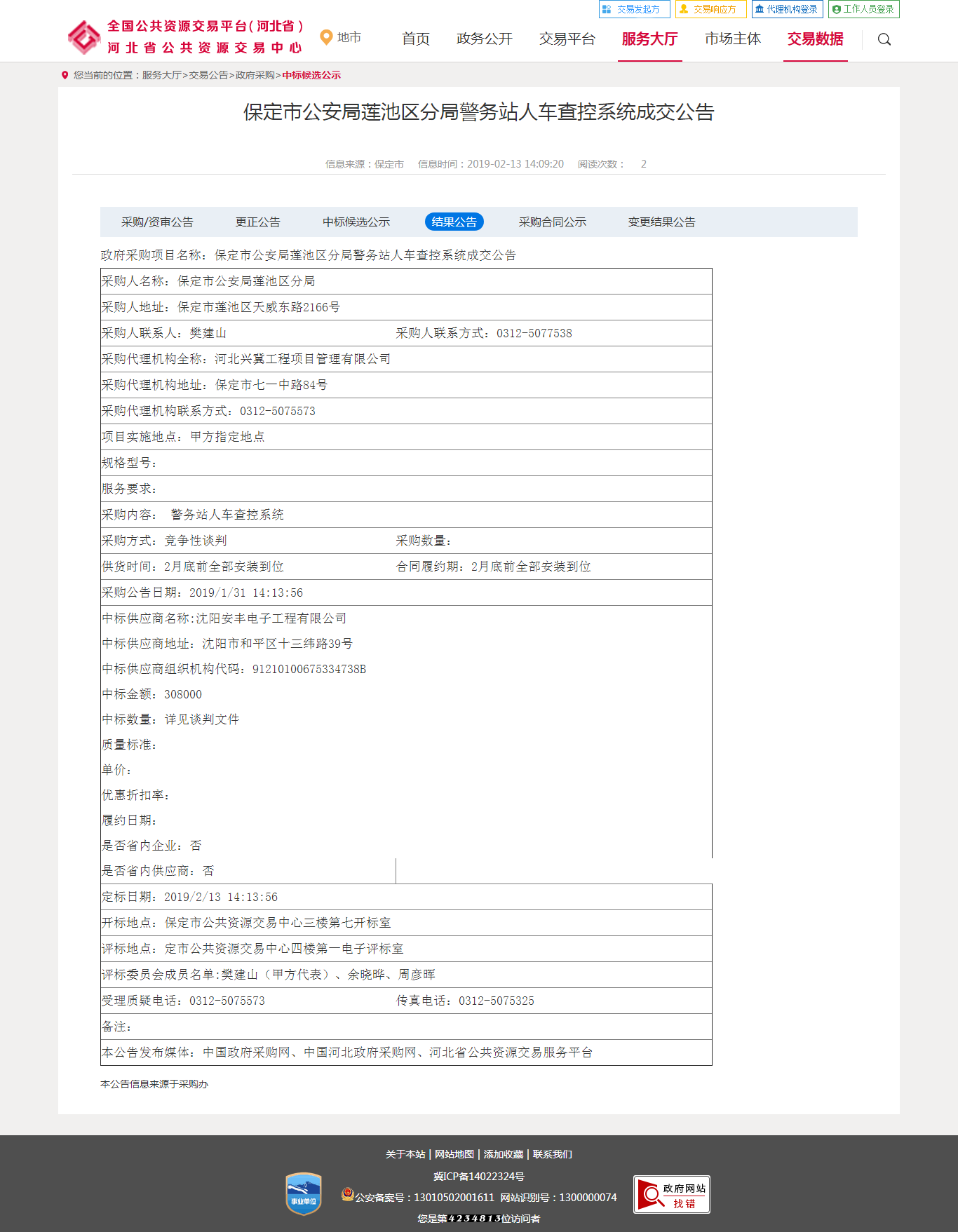 保定市公安局莲池区分局警务站人车查控系统成交公告