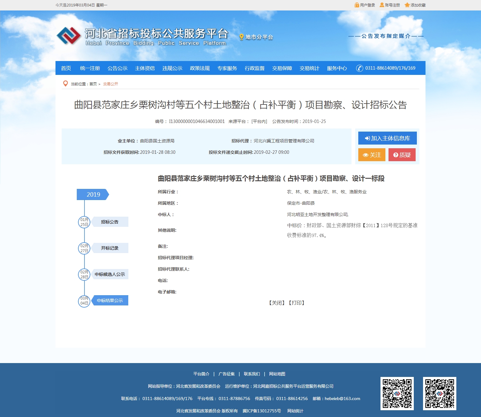 曲阳县范家庄乡栗树沟村等五个村土地整治(占补平衡)项目勘察、设计中标公示