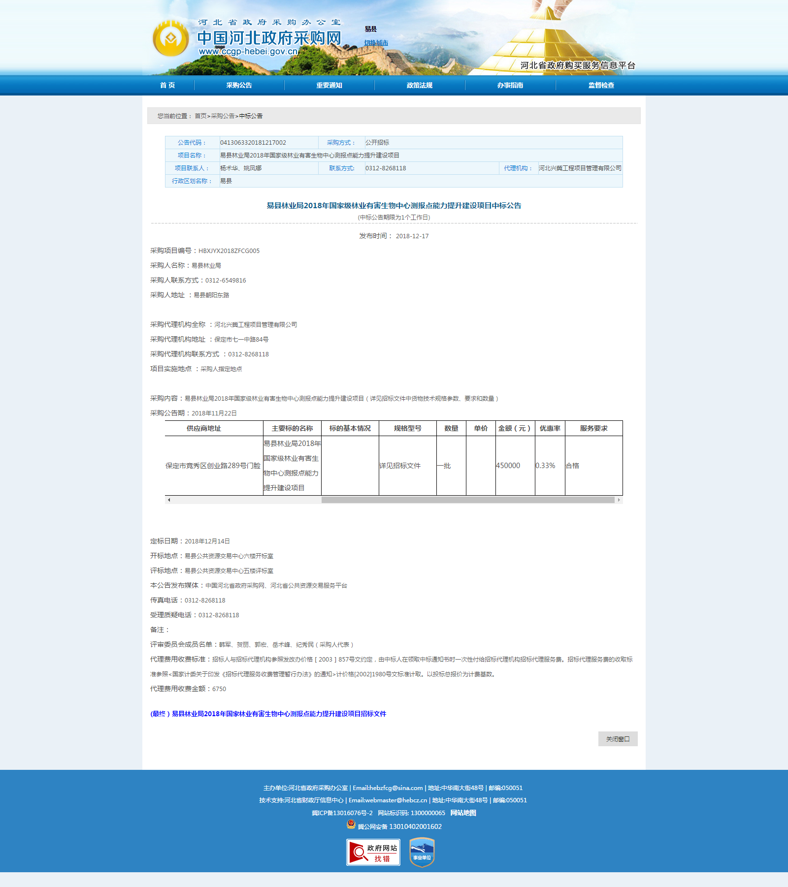 易县林业局2018年国家级林业有害生物中心测报点能力提升建设项目中标公示